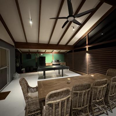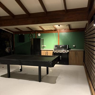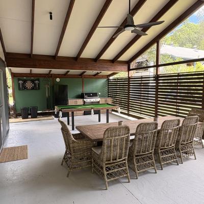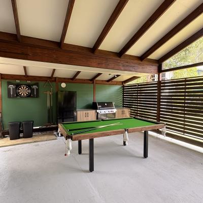 - Large outdoor entertainment area with pool table, table-tennis, and dartboard.