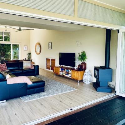 Concertina glass L-shaped doors allow guests to enjoy relaxed indoor-outdoor living between the kitchen, lounge, deck with BBQ and comfortable sun lounges to recline on.